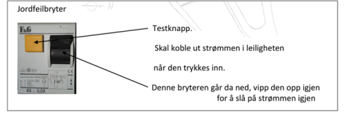 - Test jordfeilbryteren. Trykk på testknappen, og jordfeilbryteren skal koble ut strømmen i leiligheten.